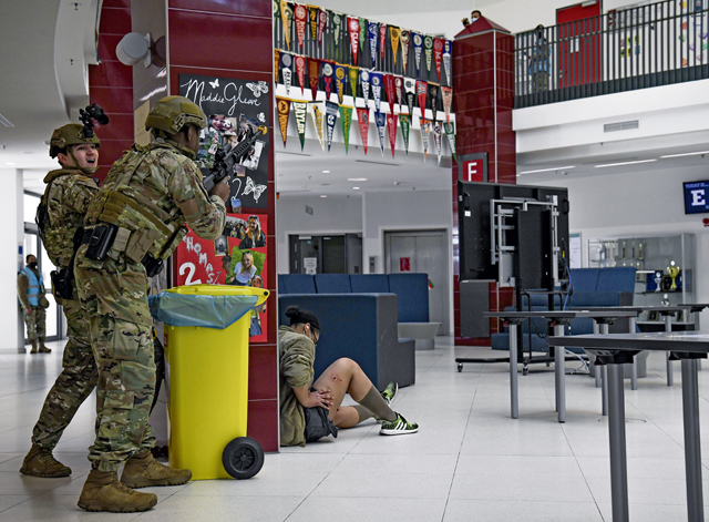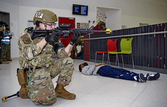 Airmen assigned to the 569th United States Forces Police Squadron neutralize a simulated active shooter threat during exercise Operation Varsity 22-1 at Kaiserslautern High School at Vogelweh Air Base, March 1. Wing inspection team members followed Airmen from various groups to collect data on how they reacted to every situation they encountered and to take note on whether or not they followed proper procedures.