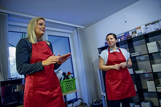 Melissa Davis, a registered dietitian, left, and Katharine Cutler, 86th Operational Medical Readiness Squadron health promotions coordinator, right, prepare a cooking demonstration at Ramstein Air Base, Germany, Dec. 12, 2022. Davis and Cutler team up to provide health services to team Ramstein through cooking and nutrition demonstrations focusing on healthy recipes to ensure mission readiness and enhancing quality of life. (U.S. Air Force photo by Airman 1st Class Jordan Lazaro)