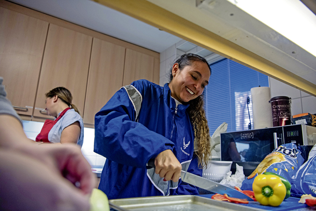 U.S. Air Force Staff Sgt. Jacqueline Collosi, 86th Mission Support Group Detachment 1 Deployment Transition Center resiliency trainer, cuts bell peppers at Ramstein Air Base, Germany, Dec. 12, 2022. Collosi was one of five Deployment Transition Center staff members who participated in a cooking demonstration hosted by the Health Promotion team to foster health and wellness in the workplace. (U.S. Air Force photo by Airman 1st Class Jordan Lazaro)