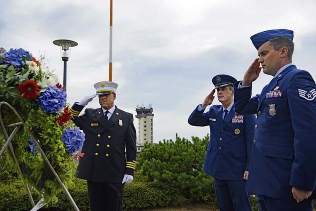 Scott E. Steil, 86th Civil Engineer Squadron assistant fire chief, U.S. Air Force Brig. Gen. Mark R. August, 86th Airlift Wing commander, and U.S. Air Force Staff Sgt. Christopher Allen, 86th CES crew chief, salute a ceremonial wreath during a 9/11 remembrance ceremony at Ramstein Air Base, Sept. 11. The wreath was laid in memory of those who died during the attacks of Sept. 11, 2001, 18 years ago.