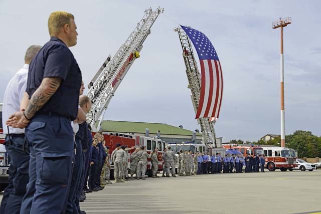 A line of first responders stand underneath a United States flag during a 9/11 remembrance ceremony at Ramstein Air Base, Sept. 11. The ceremony paid tribute to the civilians, first responders, and service members that gave their lives on Sept. 11, 2001.