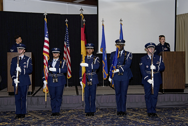 RAMSTEIN AIR BASE, Germany – Ramstein Base Honor Guard members present the colors to signify the beginning of the formal portion of the U.S. Air Force Ball at Ramstein Air Base, Germany, October 5, 2024. This year’s ball celebrated the Air Force’s 77th birthday and the 80th anniversary of D-Day. (U.S. Air Force photo by Staff Sgt. Alexandra M. Longfellow)