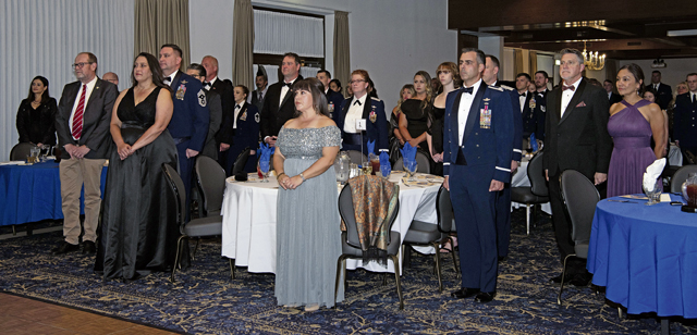 RAMSTEIN AIR BASE, Germany – Members of the audience stand during the official opening ceremony of the Air Force Ball at Ramstein Air Base, Germany, October 5, 2024. This year’s ball commemorated the Air Force’s 77th birthday and marked the 80th anniversary of D-Day. (U.S. Air Force photo by Staff Sgt. Alexandra M. Longfellow)