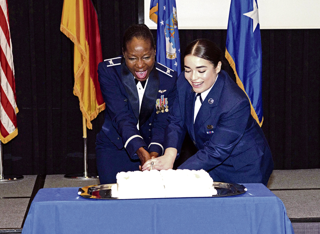 RAMSTEIN AIR BASE, Germany – U.S. Air Force Col. Michelle Wyche, 86th Aeromedical Evacuation Squadron commander, and U.S. Air Force Airman Basic Aly Pallares, 786th Force Support Squadron evaluations and recognitions technician, cut the cake at Ramstein’s Air Force Ball at Ramstein Air Base, Germany, October 5, 2024. The cake-cutting commemorates the anniversary of the Air Force’s establishment, which occurred on September 18, 1947. It symbolizes the birthday celebration of the service branch, making it a key moment in the event. (U.S. Air Force photo by Staff Sgt. Alexandra M. Longfellow)