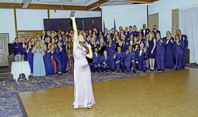 RAMSTEIN AIR BASE, Germany – Sophia Pinero, daughter of Sheena Pinero from the 86th Mission Support Group, takes a selfie in front of the 86th Mission Support Group during the Air Force Ball at Ramstein Air Base, Germany, October 5, 2024. This year’s ball commemorated the Air Force’s 77th birthday and marked the 80th anniversary of D-Day.(U.S. Air Force photo by Staff Sgt. Alexandra M. Longfellow)