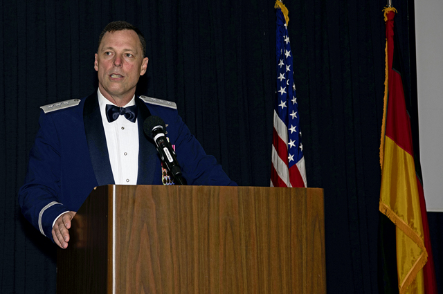 RAMSTEIN AIR BASE, Germany – U.S. Air Force Lt. Gen. Dagvin R. M. Anderson, Director for Joint Force Development, speaks at the Air Force Ball at Ramstein Air Base, Germany, October 5, 2024. Anderson served as the guest speaker at the ball, an event organized by the 86th Logistics Readiness Group to celebrate 77 years of Air Force heritage with the Ramstein community. (U.S. Air Force photo by Staff Sgt. Alexandra M. Longfellow)