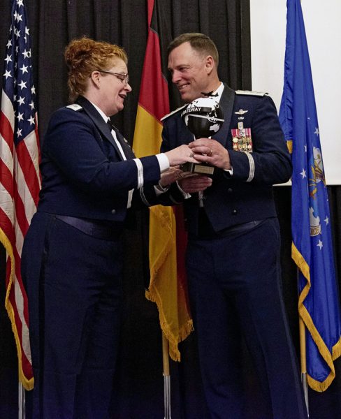 RAMSTEIN AIR BASE, Germany – U.S. Air Force Brig. Gen. Adrienne L. Williams, 86th Airlift Wing commander, presents a memento of the Global Gateway to U.S. Air Force Lt. Gen. Dagvin R. M. Anderson, Director for Joint Force Development, during the Air Force Ball at Ramstein Air Base, Germany, October 5, 2024. Anderson served as the guest speaker at the ball, an event organized by the 86th Logistics Readiness Group to celebrate 77 years of Air Force heritage with the Ramstein community. (U.S. Air Force photo by Staff Sgt. Alexandra M. Longfellow)
