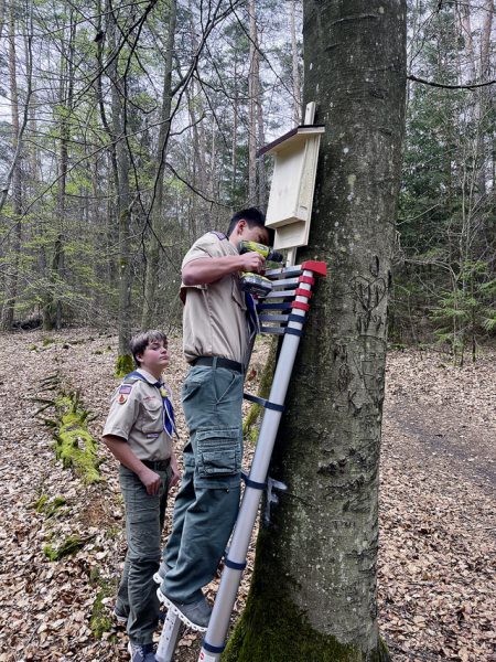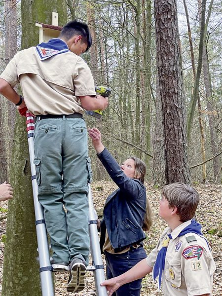 Members of boy scouts troop 12 hanging self-built bat boxes in the local forest area. This non-profit community project carried out as part of an Eagle Scout project helps to strengthen organizational skills and give back to nature.