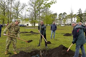 U.S. Air Force Brig. Gen. Mark R. August, 86th Airlift Wing commander, shovels dirt with members of the German forest authority, during an Earth Day tree planting ceremony on Ramstein Air Base, April 29. The tree planting symbolized support for environmental protection as well as a continued joint partnership between the 86th AW and Germany’s environmental authorities.