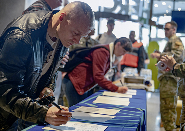 Kaiserslautern Military Community members sign-in for a motorcycle safety briefing held in the Hercules Theater at Ramstein Air Base, May 5. The annual preseason motorcycle training is designed to build awareness and personal accountability while riding a motorcycle. With proper training, riders are more likely to avoid accidents, and be aware of legal and insurance implications of a possible accident.