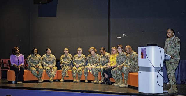 86th Airlift Wing Command Chief Master Sgt. Charmaine Kelley speaks during the Kaiserslautern Military Community Women’s Empowerment Summit at Ramstein Air Base, Aug. 26. During the summit, a panel of speakers addressed questions from the audience and shared stories from their experiences as women in the military community. Photo by Airman Regan Spinner