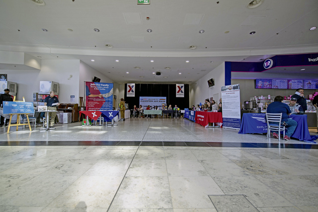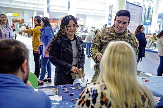 Hiring officials greet job seekers at the Kaiserslautern Military Community Center Mall during a job fair at Ramstein Air Base, March 3, 2023. Hiring officials provided information on current positions available at RAB and jobs under the Direct Hiring Authority pilot program developed by the Department of Defense. The DoD created this program to help military spouses find jobs while overseas. (U.S. Air Force photo by Airman 1st Class Jordan Lazaro)