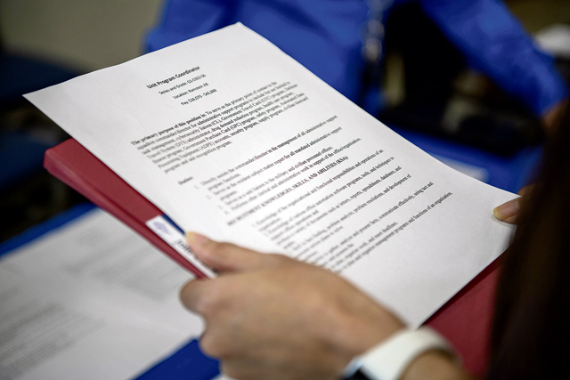 A military spouse carries a copy of their resume during a job fair at Ramstein Air Base, March 3, 2023. The job fair initiated the Direct Hiring Authority program geared toward aiding military spouses in finding jobs overseas. This event provided job information and same-day job interviews.(U.S. Air Force photo by Airman 1st Class Jordan Lazaro)