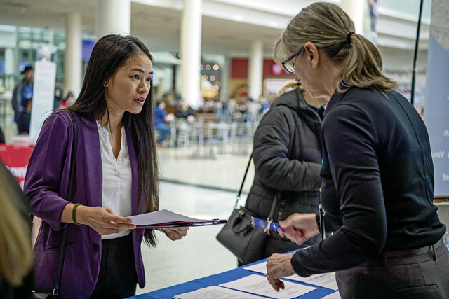 Job seekers attend a job fair at Ramstein Air Base, March 3, 2023. The job fair provided military spouses an opportunity to interview the same day for certain jobs under a Department of Defense Direct-Hire Authority pilot program. (U.S. Air Force photo by Airman 1st Class Jordan Lazaro)