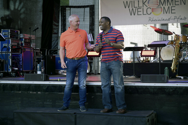Ralf Hechler, mayor of Ramstein-Miesenbach, left, shares a laugh with U.S. Air Force Brig. Gen. Otis C. Jones, 86th Airlift Wing commander, during opening remarks at the German American Friendship Festival in Ramstein-Miesenbach, June 9. The festival aims to celebrate ties between the German and American communities surrounding Ramstein Air Base.