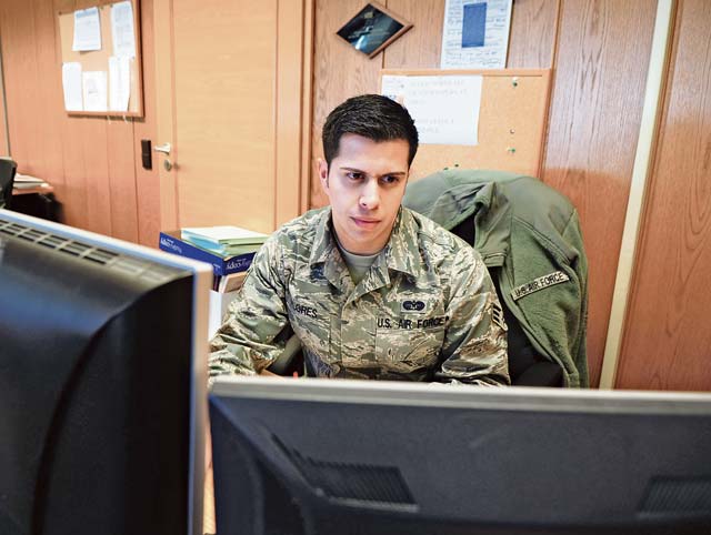 Senior Airman Jared Flores, 86th Airlift Wing paralegal, completes his portion of the legal process at the Ramstein Law Center. Law center members strive to provide on-time, on-target legal advice and services to the KMC.