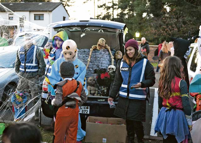 Members of the 86th Airlift Wing Safety Office hand out candy to trick-or-treaters Oct. 31 on Ramstein Air Base. After visiting decorated trunks and collecting candy, families had the opportunity to venture through a haunted trail before continuing their night of trick or treating.