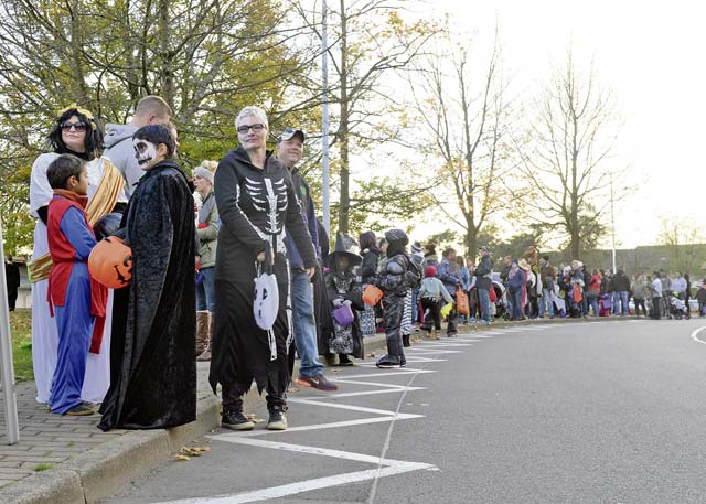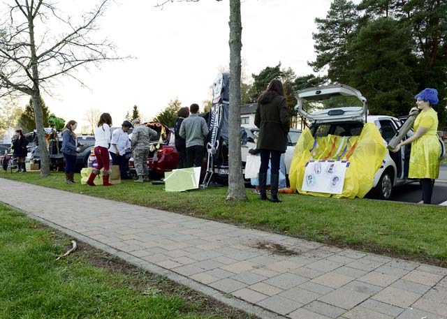 Members of the Kaiserslautern Military Community line up for a Trunk-or-Treat event at Donnelly Park Oct. 31 on Ramstein Air Base. Trunk or Treat is an annual event allowing volunteers to decorate their vehicles or designated parking space, and hand out candy to trick-or-treaters.