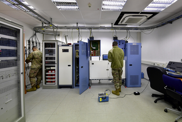 U.S. Air Force Staff Sgt. Christopher Kenny, 86th Operations Support Squadron radar airfield weather systems supervisor, left, and Senior Airman Venmeir Crowe, 86th OSS RAWS technician, work in an instrument landing system remote check and training room at Ramstein Air Base, Oct. 8. The ILS provides horizontal and vertical pinpoint accuracies for pilots to land. RAWS is one of three sections making up the Airfield Operations Flight, which comprises more than half of the 86th OSS.