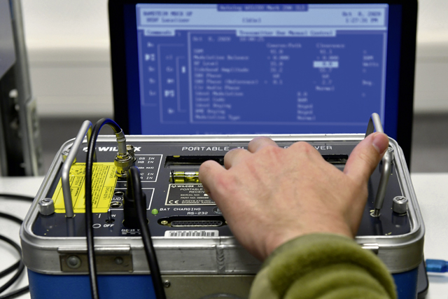 U.S. Air Force Senior Airman Venmeir Crowe, 86th Operations Support Squadron radar airfield weather systems technician, calibrates the instrument landing system using a portable instrument receiver at Ramstein Air Base, Oct. 8. The more accurate the degree marker is for the ILS, the more reliable it will be. To support Ramstein’s airlift mission, RAWS is on call 24/7 to maintain communication lines within airfield operations.