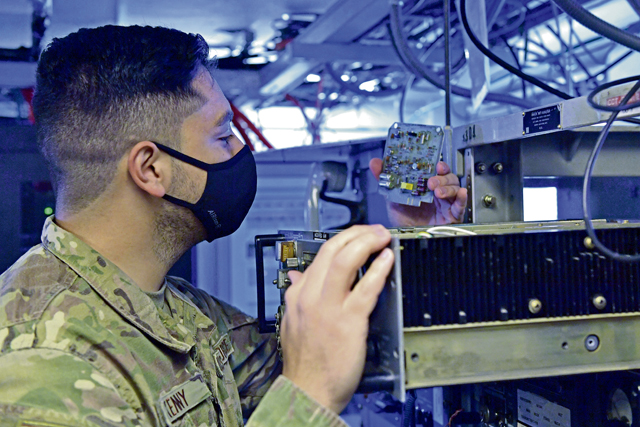 U.S. Air Force Staff Sgt. Christopher Kenny, 86th Operations Support Squadron radar airfield weather systems supervisor, inspects the main modulation card for an Air Traffic Control Tower radio at Ramstein Air Base, Oct. 8. RAWS maintains the electrical and mechanical components of the communications between air traffic controllers and aircraft.