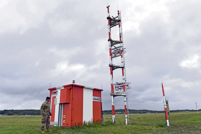 U.S. Air Force Staff Sgt. Christopher Kenny, 86th Operations Support Squadron radar airfield weather systems supervisor, stands outside a RAWS shelter on Ramstein Air Base, Oct. 8. Signals generated from the shelters are picked up by portable instrument receivers and can be used to calibrate instrument landing systems. RAWS supports Air Traffic Control and Airfield Management operations by maintaining and repairing the electrical and mechanical components of communication lines.