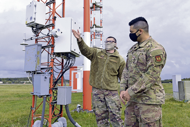 U.S. Air Force Senior Airman Venmeir Crowe, 86th Operations Support Squadron radar airfield weather systems technician, left, and Staff Sgt. Christopher Kenny, 86th OSS RAWS supervisor, explain the capabilities of an automated weather station at Ramstein Air Base, Oct. 8. In the past, RAWS consisted of airfield systems and radar systems. Airmen of the two career fields are now trained and capable in all systems across the board.