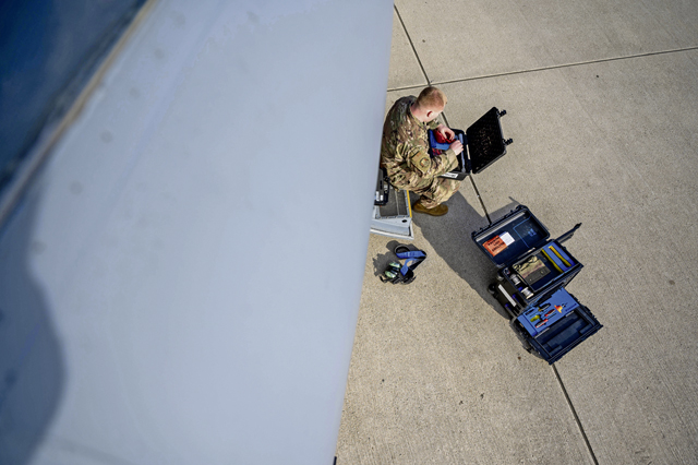 U.S. Air Force Senior Airman Dyllon Pollard, 86th Aircraft Maintenance Squadron avionics journeyman, looks for tools at Ramstein Air Base, March 24. The 86th AMXS contributes to the 86th Airlift Wing’s ability to provide immediate air mobility at a moment’s notice.