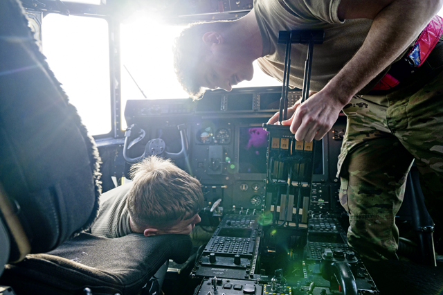 U.S. Air Force Senior Airman Logan Gibbs, 86th Aircraft Maintenance Squadron avionics journeyman, left, and Senior Airman Vanessa Hall, 86th AMXS avionics journeyman, right, discuss solutions with other Airmen inside a C-130J Super Hercules aircraft to help fix a throttle at Ramstein Air Base, March 24. Proper installation of the mounting bracket enhances system stability, helping maintain aircraft readiness and preventing in-flight component failure. Photos by Senior Airman Dylan Myers