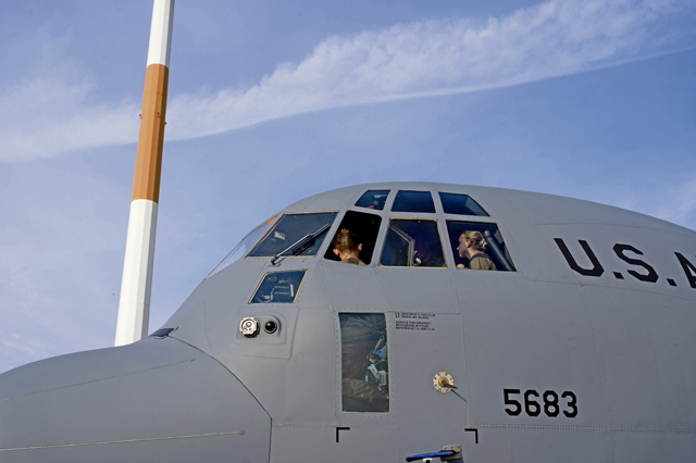 U.S. Air Force Senior Airman Logan Gibbs, 86th Aircraft Maintenance Squadron avionics journeyman, adjusts a throttle on a C-130J Super Hercules aircraft at Ramstein Air Base, March 24.