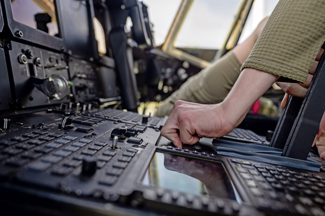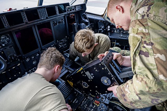 U.S. Air Force Senior Airman Logan Gibbs, 86th Aircraft Maintenance Squadron avionics journeyman, middle, and Airman 1st Class Justin Clark, 86 AMXS avionics journeyman, left, and Senior Airman Dyllon Pollard, 86th AMXS avionics journeyman, right, help fix a throttle inside a C-130J Super Hercules aircraft at Ramstein Air Base, March 24. By restoring full functionality to the throttle quadrant, Airmen help guarantee the aircraft remains capable for rapid deployment ensuring mission readiness.