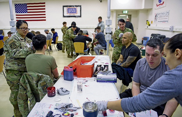 86th Medical Group personnel prepare volunteers during a moulage before exercise Ready Eagle II at Ramstein Air Base, Germany, April 27, 2023. A moulage is the process where makeup is applied to simulate injuries, helping provide realism during the exercise. These types of exercises improve emergency preparedness, response time, and identify areas of improvement. (U.S. Air Force photo by Airman 1st Class Kaitlyn Oiler)