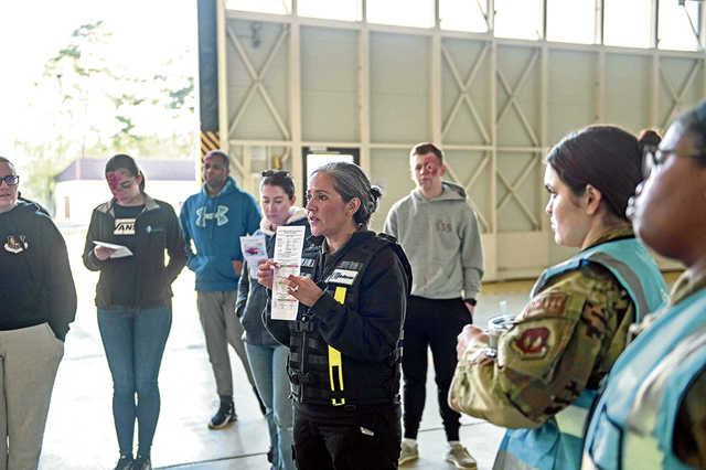 Norma Patricia Grandberry, U.S. Air Force Ready Eagle instructor, center, briefs volunteers before exercise Ready Eagle II at Ramstein Air Base, Germany, April 27, 2023. The exercise simulated medical emergencies from the aftermath of an explosion in a hangar. The Kaiserslautern Military Community Fire and Emergency Services firefighters and 86th Medical Group personnel participated in the exercise and were evaluated on providing emergency care to the simulated patients. (U.S. Air Force photo by Airman 1st Class Kaitlyn Oiler)
