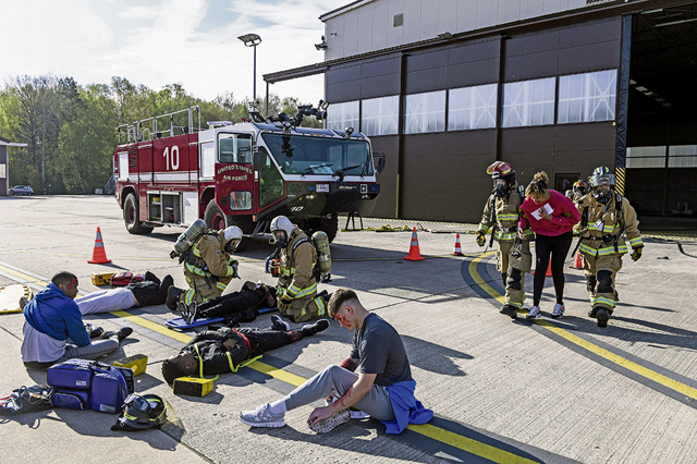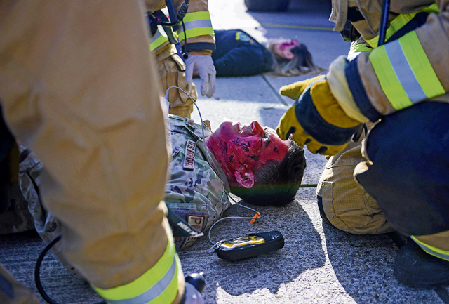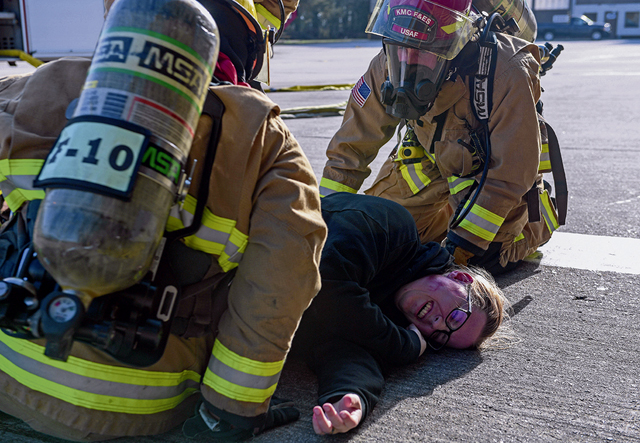 Kaiserslautern Military Community Fire and Emergency Services firefighters provide emergency care to a volunteer at Ramstein Air Base, Germany, April 27, 2023. Exercise Ready Eagle II simulated an explosion at a hangar to test the skills of 86th Medical Group personnel and first responders, increasing preparedness for a variety of emergency scenarios. (U.S. Air Force photo by Airman 1st Class Kaitlyn Oiler)