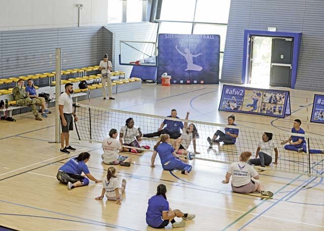 Air Force Wounded Warrior participants play sitting volleyball, July 24 at Ramstein Air Base. The 2019 United States Air Forces in Europe Warrior Care Event was held from July 22 to 26 and featured a variety of sports, workshops and mental wellness activities
