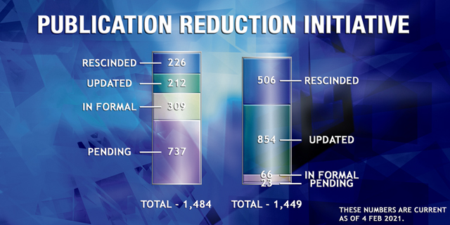 As of February, 506 publications have been rescinded, 854 have been updated and 66 are currently in formal coordination with only 23 publications awaiting review.