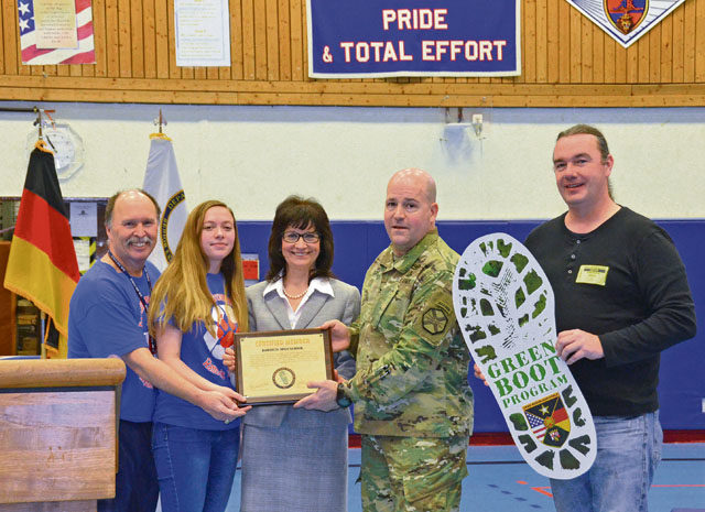 Active energy conservation plus a smaller ecological footprint equaled a Green Boot certification for Ramstein High School from the U.S. Army Garrison Rheinland-Pfalz Feb. 15.