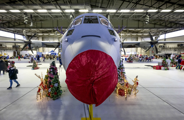 A C-130J Super Hercules aircraft is decorated to emulate Rudolph the Red-Nosed Reindeer during a Rudolph the Red-Nosed Herc event at Ramstein Air Base, Dec. 6. As part of an annual tradition, a Super Hercules is decorated to look like Rudolph the Red-Nosed Reindeer. Service members and their families from the Kaiserslautern Military Community were invited to enjoy the festivities and take a picture with Santa Claus during the event. Photo by Senior Airman Jared Lovett