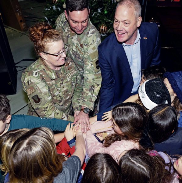 (Left) U.S. Air Force Brig. Gen Adrienne L. Williams, 86th Airlift Wing commander, U.S. Air Force Chief Master Sgt. Louis Ludwig, 86th Airlift Wing command chief and Ralf Hechler, City and Union Community Ramstein-Miesenbach mayor, along with other participants at the Rudolph the Red-Nosed Herc event, turn on the Christmas tree lights at Ramstein Air Base, Dec. 6.