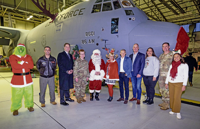 86th Airlift Wing and Kaiserslautern Military Community leaders pose for a photo in front of a C-130J Super Hercules aircraft during a Rudolph the Red-Nosed Herc event at Ramstein Air Base, Dec. 6. As part of an annual tradition, a Super Hercules is decorated to look like Rudolph the Red-Nosed Reindeer.