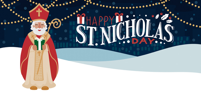 Saint,Nicholas,Holding,Gift.,St.,Nicolas,In,The,Winter,City