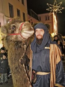 Every afternoon at 4 p.m., the Three Holy Kings from the Orient and their camels will go through the center of town. Back at their camp they will perform the Christmas story in colorful scenes.