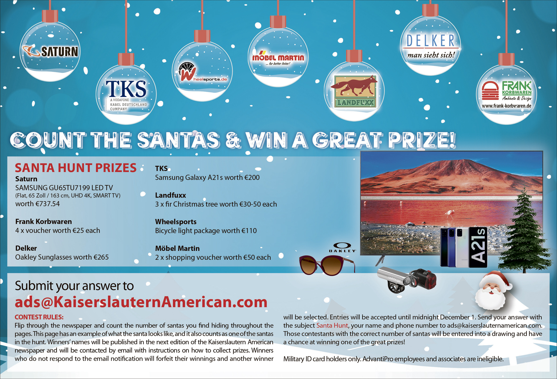 Count the Santas in this week’s Kaiserslautern American and submit your answer to ads@kaiserslauternamerican.com with ‘Santa Hunt’ in the subject line, your name and contact phone number, by midnight December 1. Winners will be announced in the December 4 edition of the Kaiserslautern American and posted below.