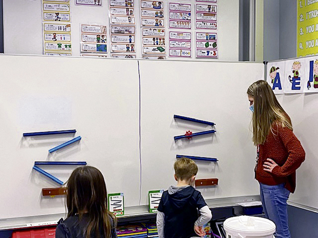 Mrs. Wallace (right) with Joshua Nohrenberg (middle) and Maereen Beaty (left) discovering motion using inclines and ramps to move wheels. Photos by Dana Kockx