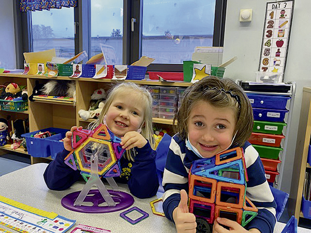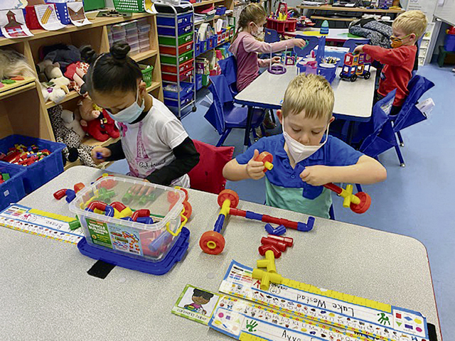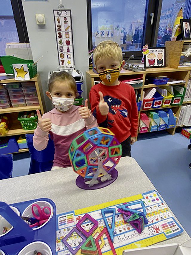 Isabella Bravo (left) and Luke Westad (right) building different transportation vehicles with plastic snaps.