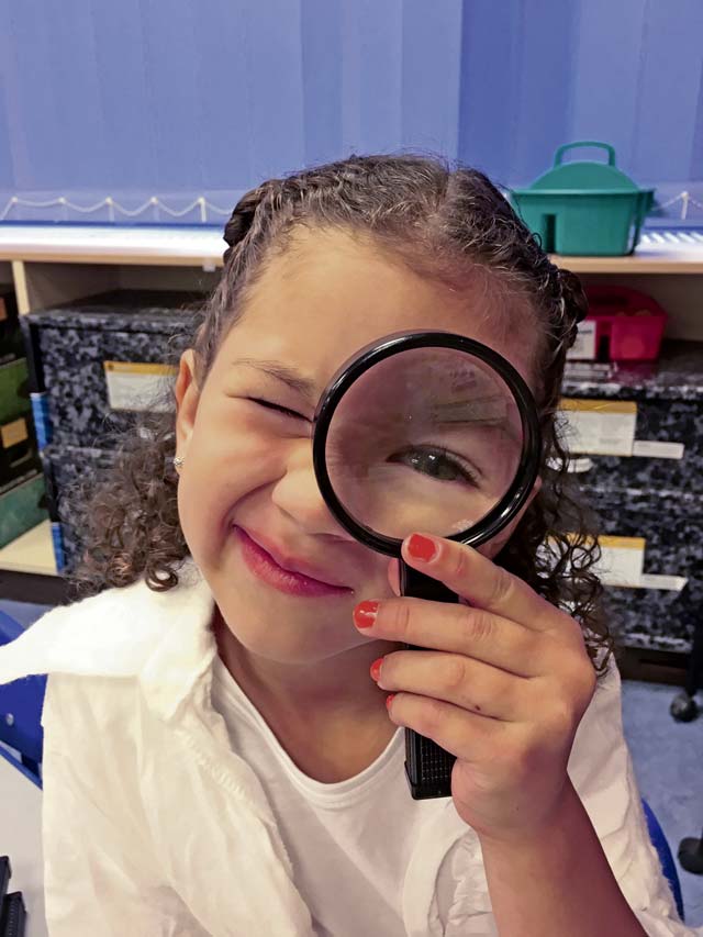 In Dana Kockx’s kindergarten classroom at Landstuhl Elementary Middle School, Rosalie Hurtado is “seeing” what it is like to be a scientist and looks through a magnifying glass