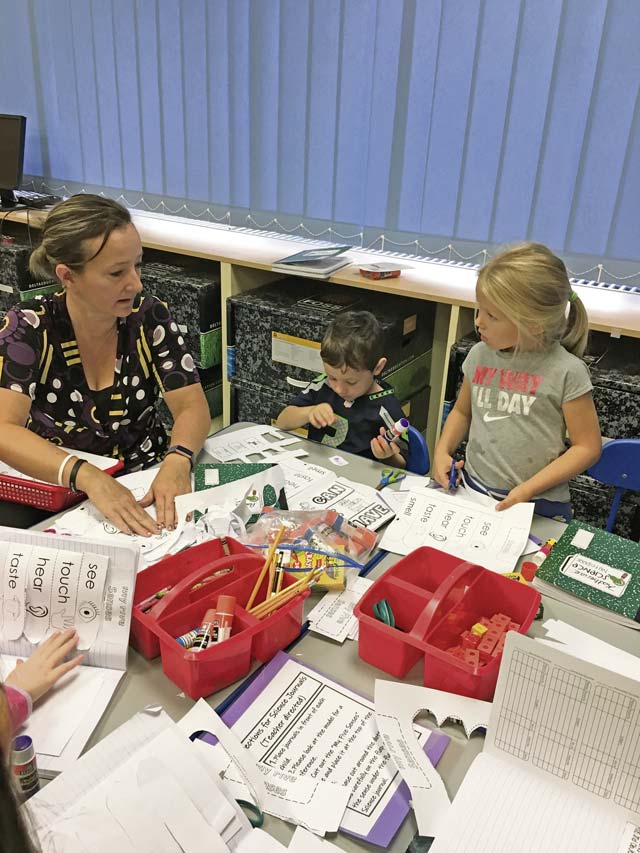 Dana Kockx helps Katherine Dwyer and Dominic De La Cruz with five senses journal inserts.