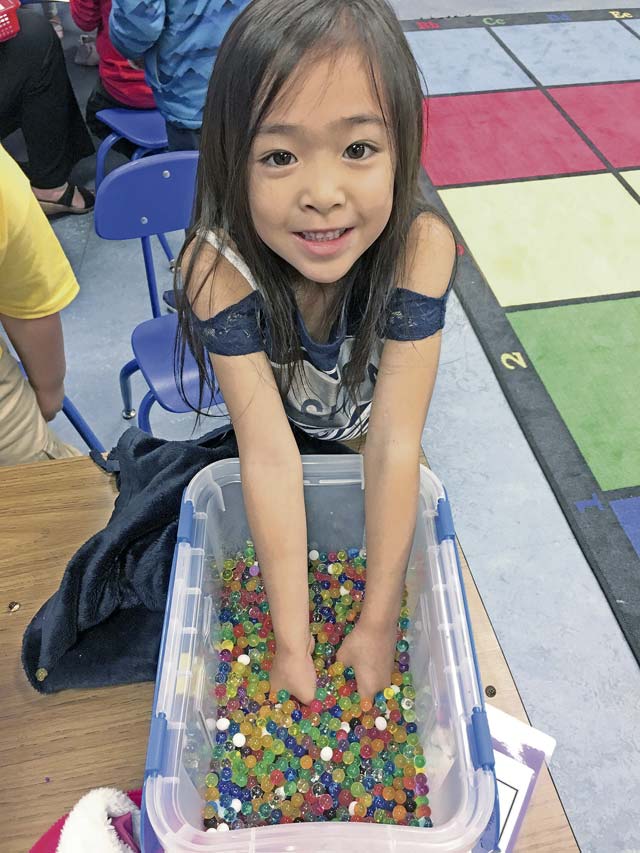 Kalisse Naoe is using one of her five senses and plunging into the water bead station during Science Lab.
