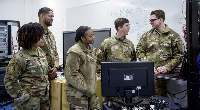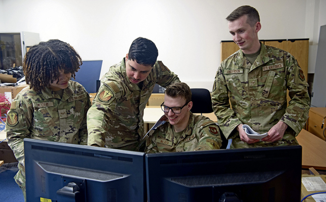 U.S. Air Force Airmen from the 86th Communications Squadron gather around a computer for training, at Ramstein Air Base, Germany, April 4, 2024. The 86th Communications Squadron works toward maintaining a smooth flow of communication that keeps the base running. (U.S. Air Force photo by Airman first Class Olivia Sampson)