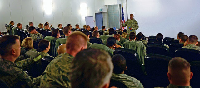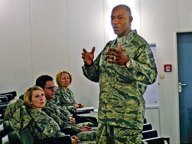 Chief Master Sgt. Kaleth O. Wright, U.S. Air Forces in Europe and Air Forces Africa command chief, speaks to senior NCOs at the 86th Medical Group Top 3’s Senior NCO Symposium Jan. 17 on Ramstein. Wright spoke about the importance of deliberate development.